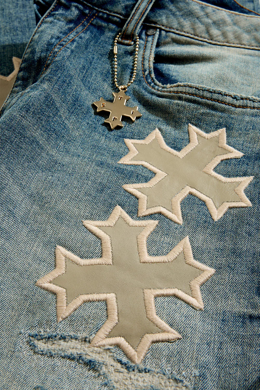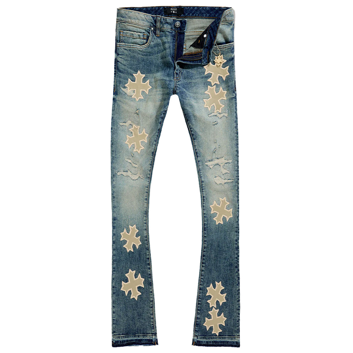 These regular rise, desert storm wash jeans from See You in Paradise feature a tight fit from waist to thigh, extended length inseam for maximum stacks, a flared leg opening, rip & repair design with self-fabric backing, and deep front pockets for smartphones.