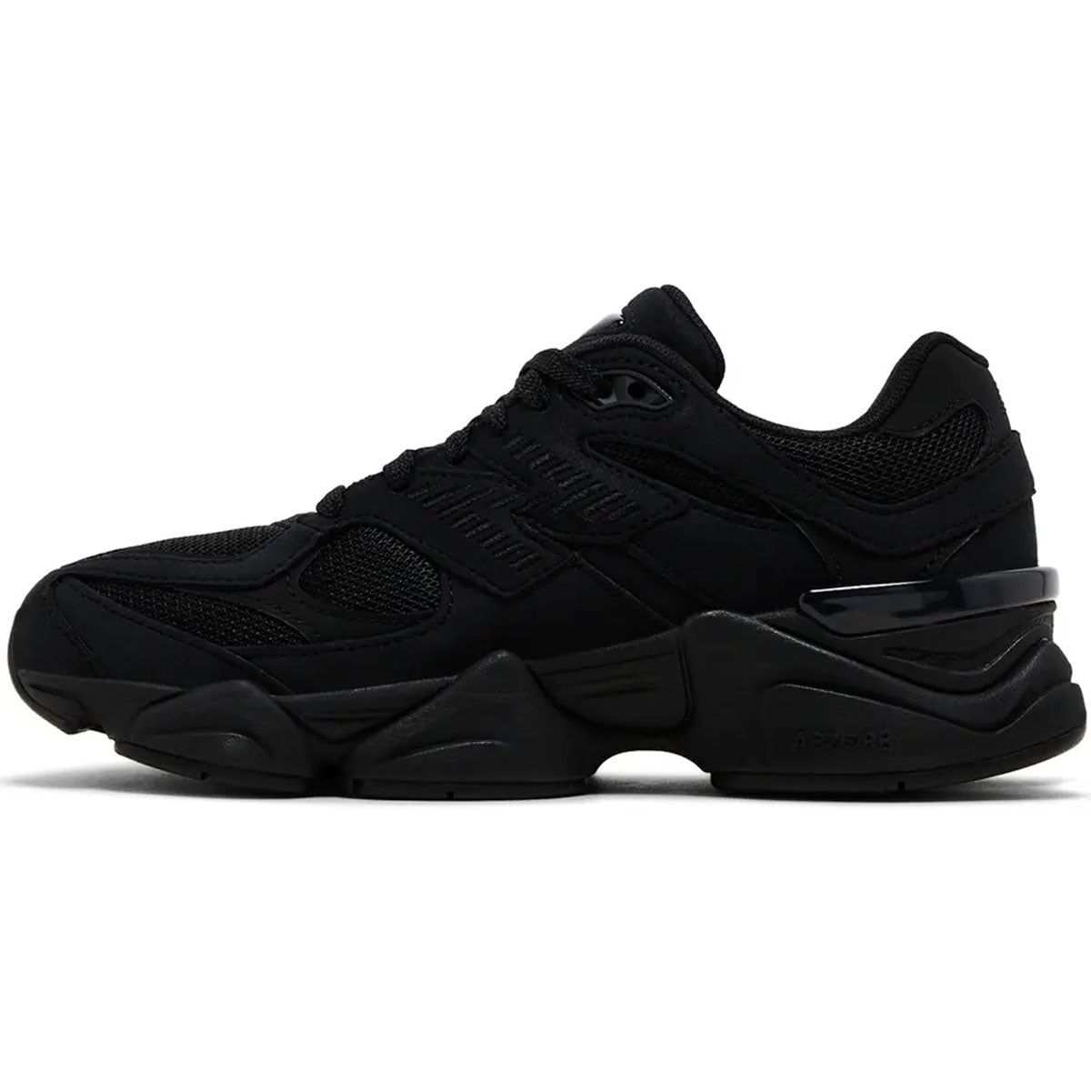 This New Balance 9060 features a triple black colorway with contrasting leather, suede, and rubber materials.