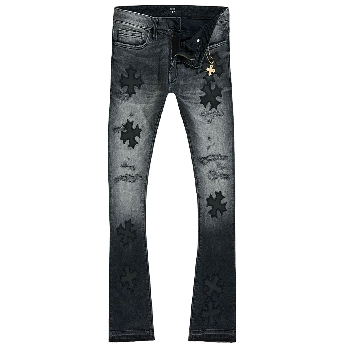 These regular rise, black shadow wash jeans from See You in Paradise feature a tight fit from waist to thigh, extended length inseam for maximum stacks, a flared leg opening, rip & repair design with self-fabric backing, and deep front pockets for smartphones.