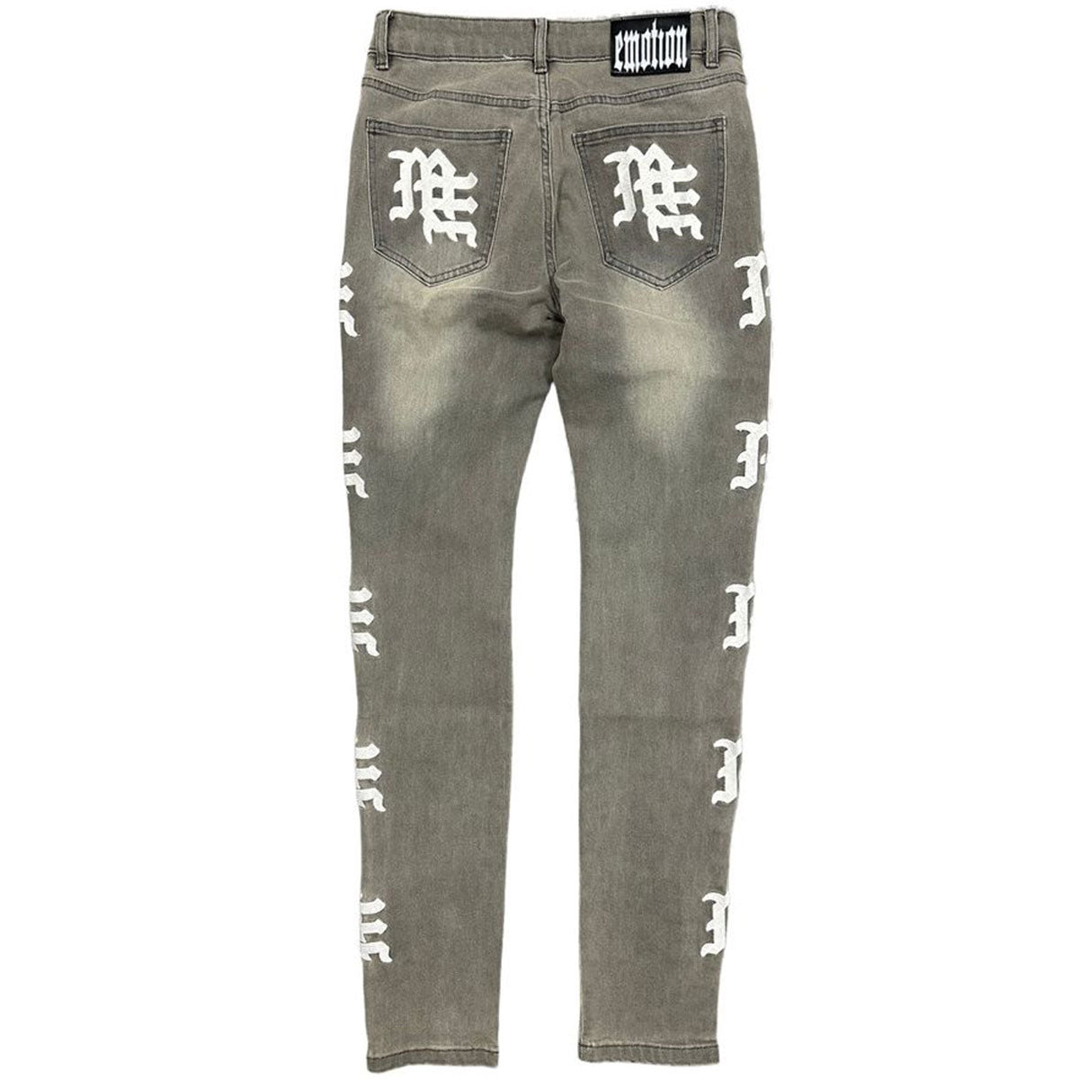These regular rise, Ash Grey wash jeans from Mixed Emotion feature aggressive rips on front and multiple monogram details on both front and rear.