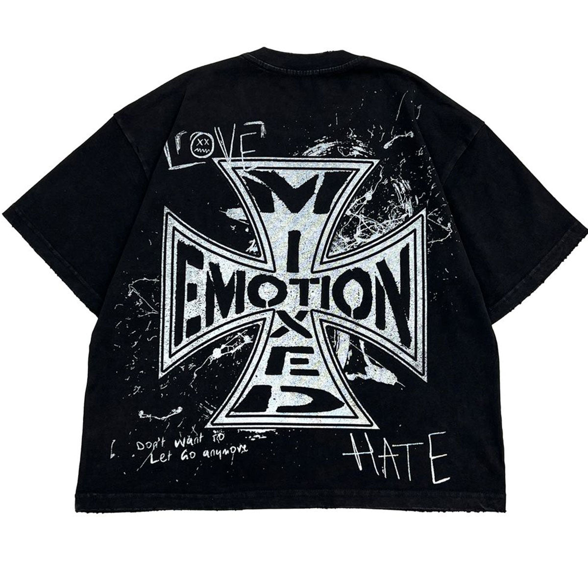 This black t-shirt from Mixed emotion features multiple scribble love emotions graphics on front and a matching large biker logo on rear.
