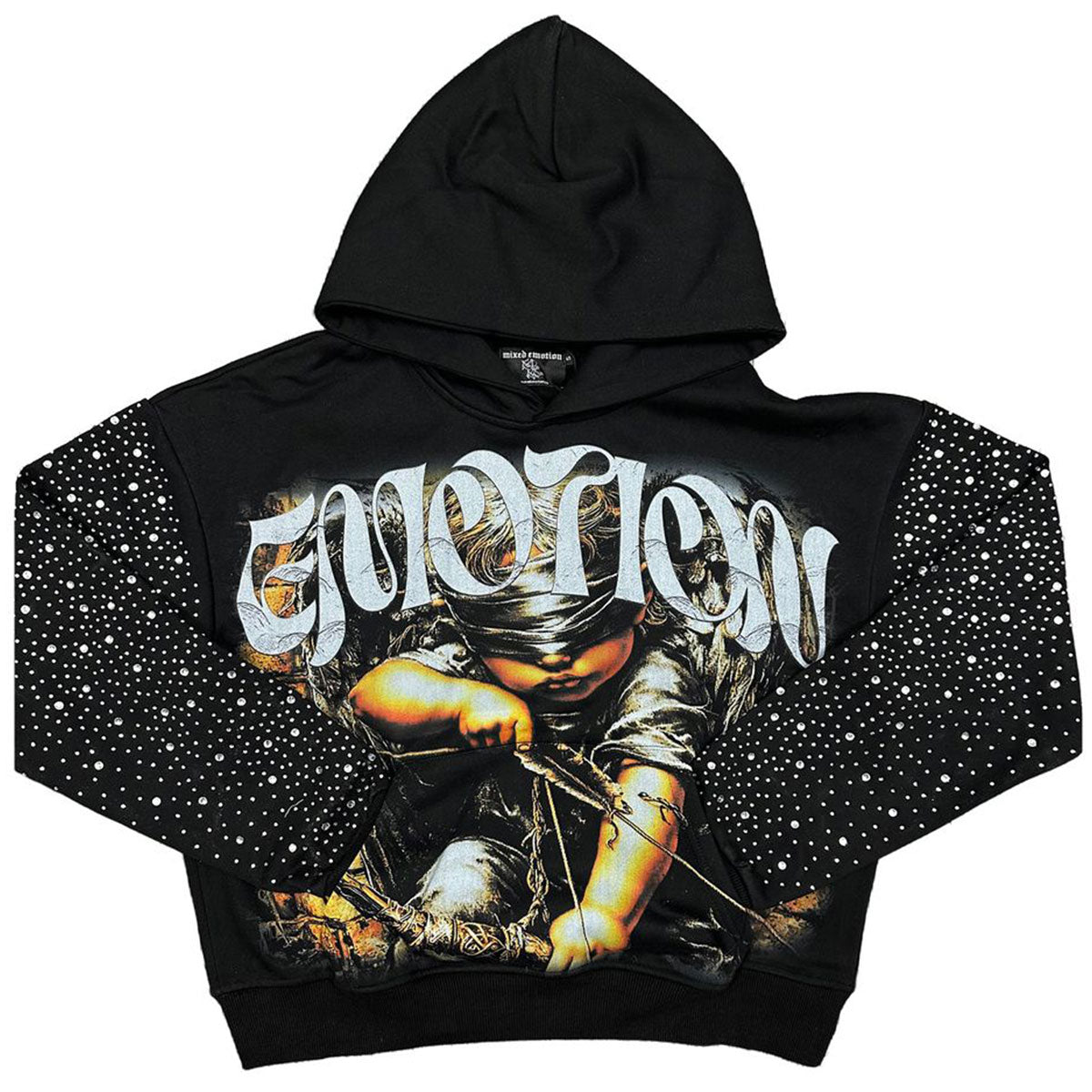 This black hoodie from Mixed Emotion features an extensive array of rhinestone details with a large archer angel branded graphic on front and a large logo on rear.
