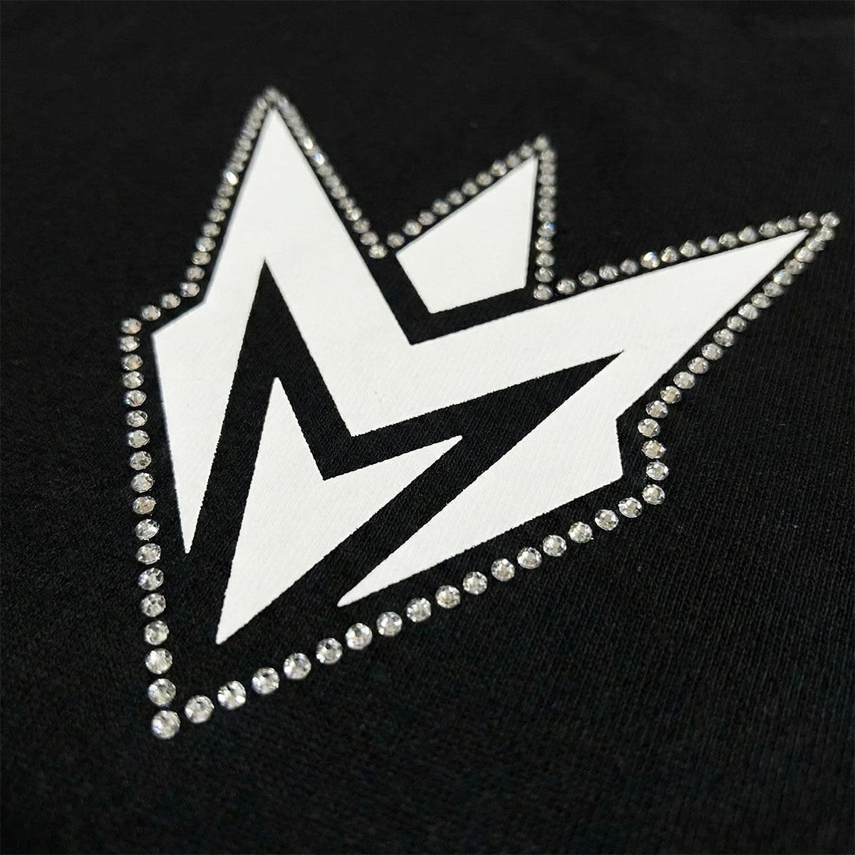 This black t-shirt for kids from MNTAL Co. feature the signature M Spike logo on front in white with silver rhinestone details and a matching small silicone logo patch on rear.