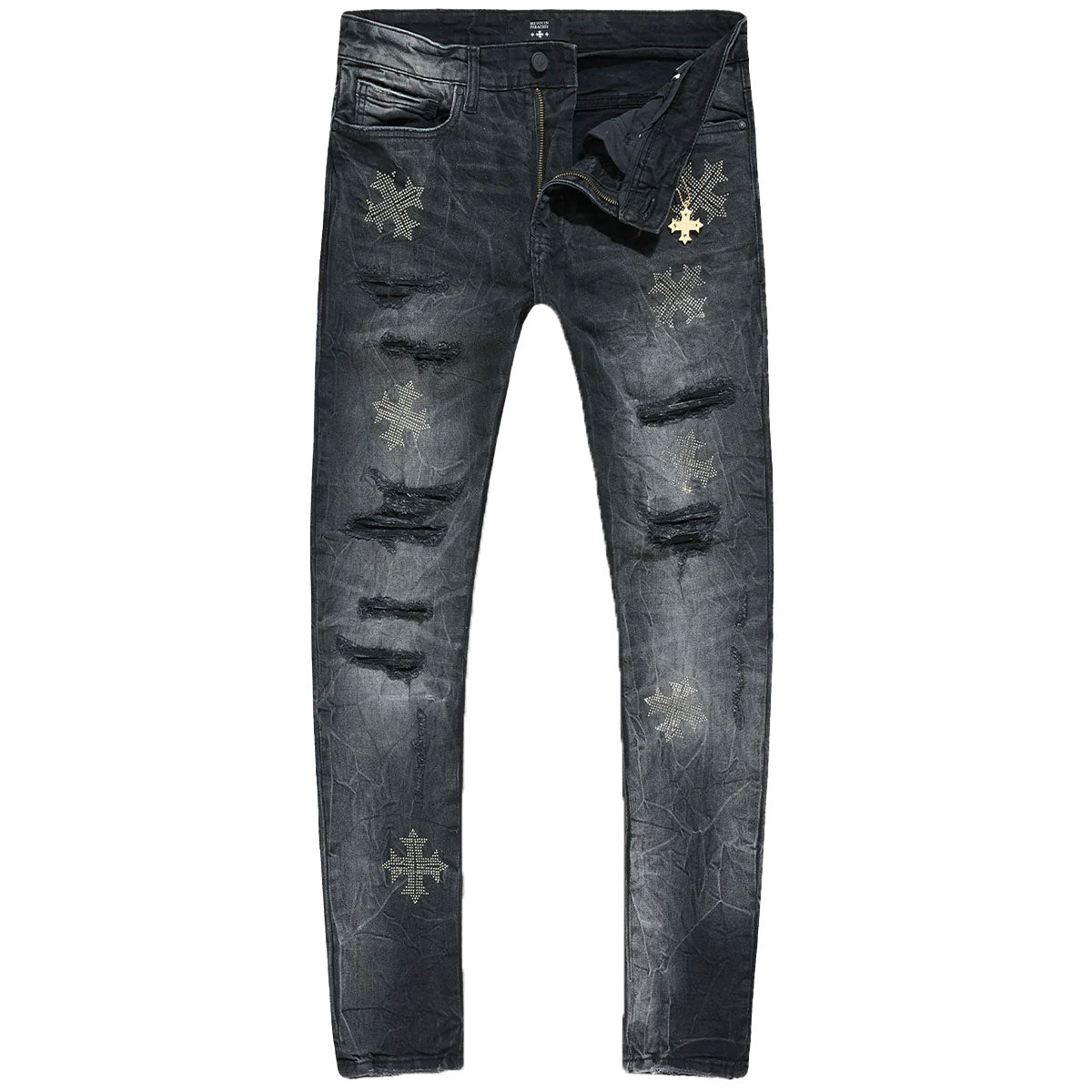 Estos pantalones negros de tiro regular de See You in Paradise tienen un corte ajustado, un ajuste cómodo desde la cintura hasta el muslo, un ajuste cómodo desde la rodilla hasta el tobillo, detalles de diamantes de imitación en todas partes, arrugas horneadas en 3D, diseño de reparación y desgarro con respaldo de mezclilla cruda y un ajuste súper elástico.